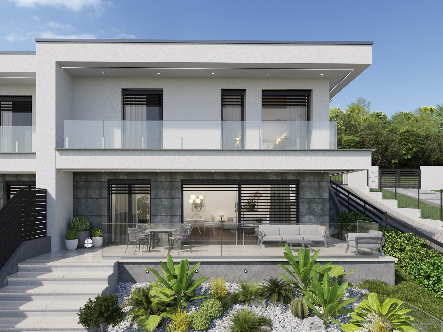 Eladó a III. kerületben, Péterhegyen ÚJ ÉPÍTÉSŰ, ENERGIATAKARÉKOS, ÖRÖKPANORÁMÁS, kétszintes, nettó 150 nm-es ikerház, hatalmas üvegkorlátos teraszokkal, saját 500 nm telekkel.